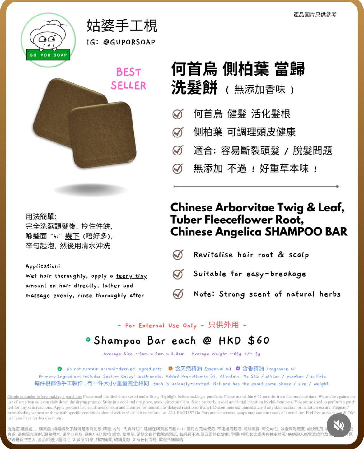 何首烏、側柏葉、當歸 *何首烏 健髪 活化髪根 *側柏葉 調理頭皮健康 *改善脫髮、頭髮斷裂問題 *香味:無添加,但有藥材本來的草本味 洗髪餅用法簡單:- 完全洗濕頭髮後,拎住件餅在髪面”Hi”幾下(唔好多),卒勻起泡,然後用清水沖洗。 每舊餅附送一個絲瓜絡碟,超方便好用!